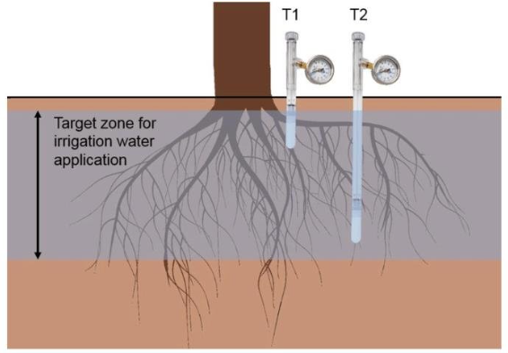 A device that measures soil moisture tension or suction, i.e. how tightly water is held around the soil particles. And how difficult it is for plants roots to extract it from the soil.